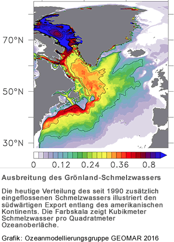 Ein internationales Wissenschaftlerteam hat jetzt mit einem am GEOMAR Helmholtz-Zentrum für Ozeanforschung Kiel neu entwickelten Computermodell die Ausbreitungswege und Auswirkungen des Schmelzwassers detailliert simuliert. "Die Einflüsse der schmelzenden Grönlandgletscher bleiben zunächst geringer als befürchtet, da ein grosser Teil des Schmelzwassers entlang des amerikanischen Kontinents nach Süden abfliesst und damit Veränderungen in den kritischen Bereichen des Nordatlantiks verzögert werden", fasst Prof. Dr. Claus Böning vom GEOMAR die Ergebnisse zusammen. Er ist Erstautor der Studie, die heute in der internationalen Fachzeitschrift Nature Geoscience erscheint.