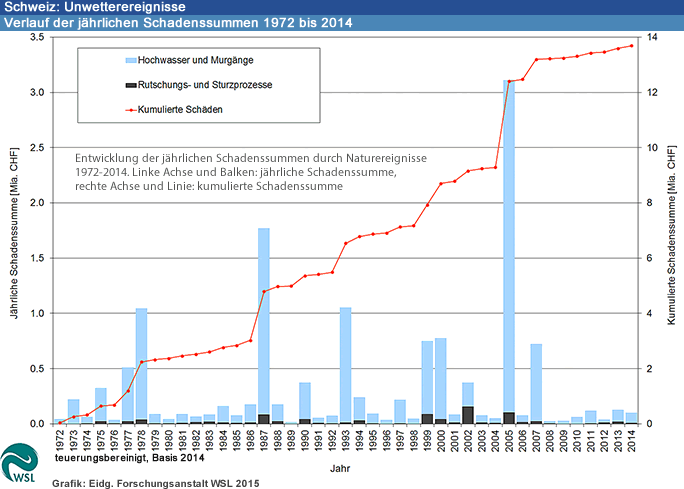 Hochwasser, Murgänge, Rutschungen sowie Steinschlag und Felssturz verursachten 2014 in der Schweiz Schäden von rund 100 Millionen Franken. Tragischerweise forderten die Ereignisse sechs Todesopfer, fünf davon infolge von Rutschprozessen. Die materiellen Schäden lagen unter denen des Vorjahres (125 Millionen Franken) und deutlich unter dem teuerungsbereinigten Durchschnitt der Jahre 1972 bis 2013. Der grösste Teil der Schäden ist auf Hochwasser zurückzuführen (90 Millionen Franken), meistens ausgelöst durch lokale Gewitterniederschläge. Dies zeigt die aktuelle Auswertung der Unwetterschadens-Datenbank der Eidg. Forschungsanstalt für Wald, Schnee und Landschaft WSL.