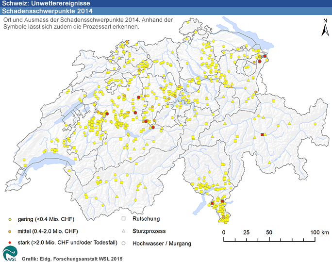 Schadenskosten im Umfang von knapp 90 Millionen Franken waren 2014 auf Hochwasser zurückzuführen. Rund 8 Prozent der Gesamtschäden wurden durch Rutschungen ausgelöst, was dem Durchschnitt der letzten zwölf Jahre entspricht. Überdurchschnittlich hingegen ist die Anzahl der durch Rutschprozesse umgekommenen Menschen. So forderten z.B. die Ereignisse in Tiefencastel GR, als am 13. August ein Zug der Rhätischen Bahn aufgrund einer Hangmure entgleiste, ein Todesopfer. Des Weiteren wurde am 5. November in der Gemeinde Curio TI ein ungefähr 150 m von der Waldgrenze entfernt stehendes Rustico zwischen Nerocco und Bombinasco nach sehr ergiebigen Regenfällen von herabstürzendem Erdreich einer Hangmure verschüttet. Eine Frau und ihre Tochter kamen dabei ums Leben. In Davesco verschüttete am 16. November ein Erdrutsch ein 3-stöckiges Wohngebäude. Dabei wurden vier Personen verletzt und zwei kamen ums Leben.