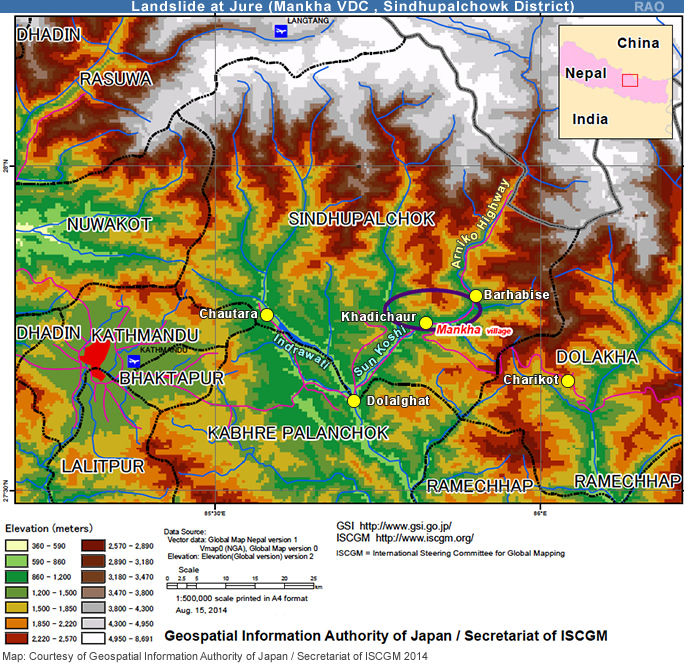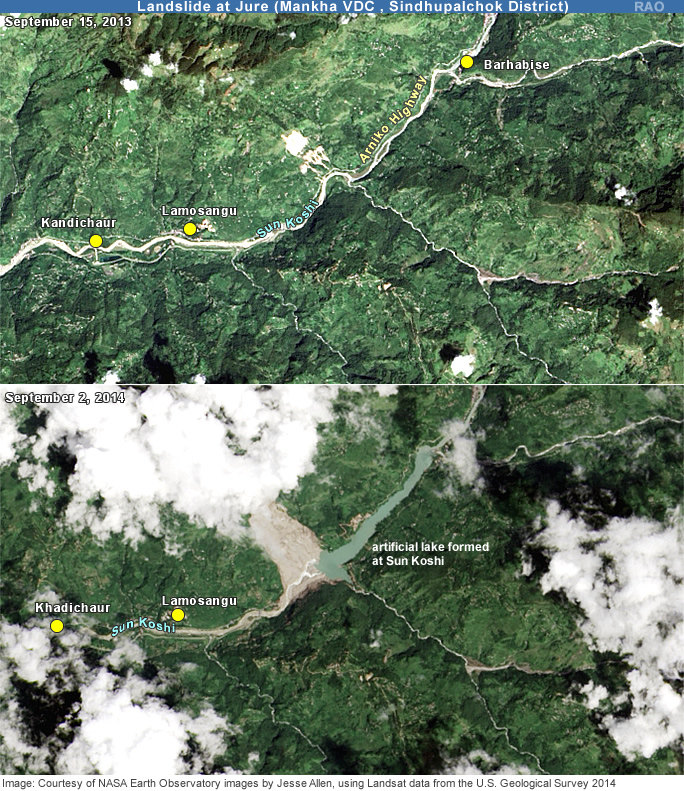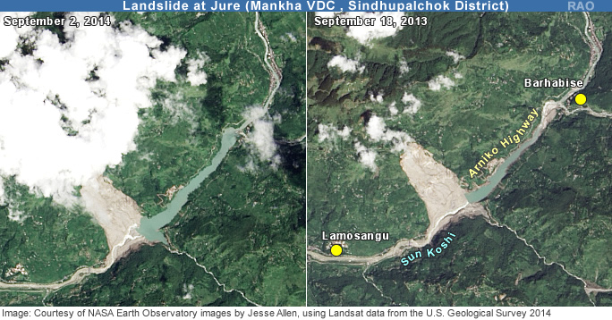 Am 2. August 2014 löste sich bei Jure (Mankha VDC, Sindhupalchok Distrikt) am Westabhang oberhalb des Flusses Sun Koshi rund 5,5 Millionen Kubikmeter Fels- und Schuttmaterial und donnerte talwärts, bedeckte das Dorf Jure und und den Arniko Highway, die wichtigste Verkehrsverbindung von Kathmandu nach Lhasa in Tibet, und staute schliesslich den Sun Koshi auf. Der rund 55 m hohe Erdwall liess kein Flusswasser mehr passieren. Die Stromproduktion in Nepal sank um 10%, weil oberhalb von Lamosangu ein Unterwerk zerstört und und das Sun Koshi-Kraftwerk weiter flussabwärts schwer beschädigt wurde.
