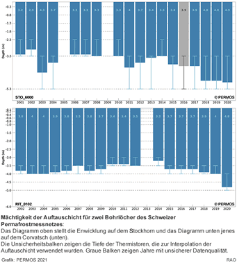 Im Jahr 2020 war die Auftauschicht an den PERMOS Standorten zwischen knapp 3 m (Flüelapass GR, 2'400 m ü.M.) und 11 m (Schilthorn BE, 2'900 m ü.M.) tief. Damit hat sich zum Beispiel die Mächtigkeit der Auftauschicht am Schilthorn seit Beginn der Messungen 1998 mehr als verdoppelt.