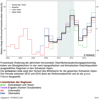 Wie die Oberflächen- und Permafrosttemperaturen sind auch die Blockgletschergeschwindigkeiten im Jahr 2020 nahe oder sogar über dem bisherigen Rekord aus dem Jahr 2015.