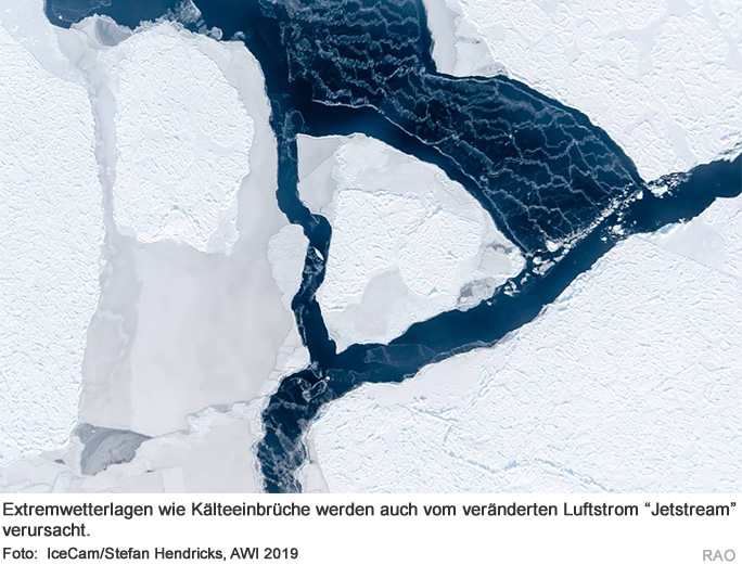 Demnach führt der Meereisrückgang und die damit verbundene grössere Aktivität atmosphärischer Wellen zu einer durch das Ozon verstärkten deutlichen Aufheizung der polaren Stratosphäre. Da die tiefen polaren Temperaturen der Antrieb für den Jetstream sind, schwächt dieser sich durch diese Temperaturerhöhung in der Stratosphäre ab. Diese Abschwächung des Jetstreams setzt sich nun ausgehend von der Stratosphäre nach unten durch, was zu Wetterextremen führt.