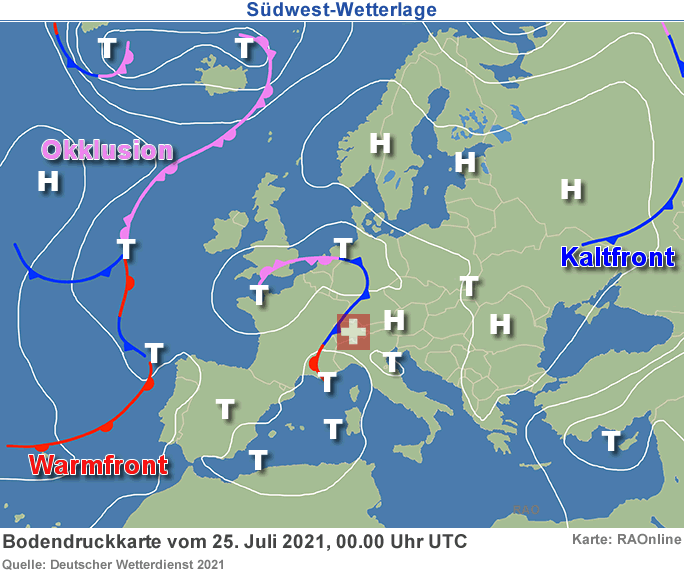 Die Schweiz lag am 25. Juli 2021 weiterhin im Einflussbereich eines Tiefdruckgebiets mit Kern über der Nordsee. Dieses führt mit einer mässigen südwestlichen Höhenströmungschubweise feuchte und instabile Luft zum Alpenraum.