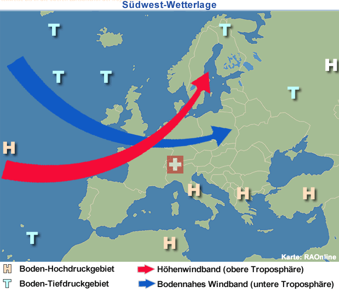 Die zyklonale Südwest-Wetterlage ist eine typische Grosswetterlage, welche sich häufig über Mitteleuropa aufbaut. Bei Südwest-Lagen breitet sich von den Azoren bis nach Nordskandinavien eine Tiefdruckrinne aus. Südlich von dieser Tiefdruckrinne bestimmen in einem Streifen von Spanien über West- und Zentraleuropa bis nach West-Russland Hochdruckgebiete das Wetter.
