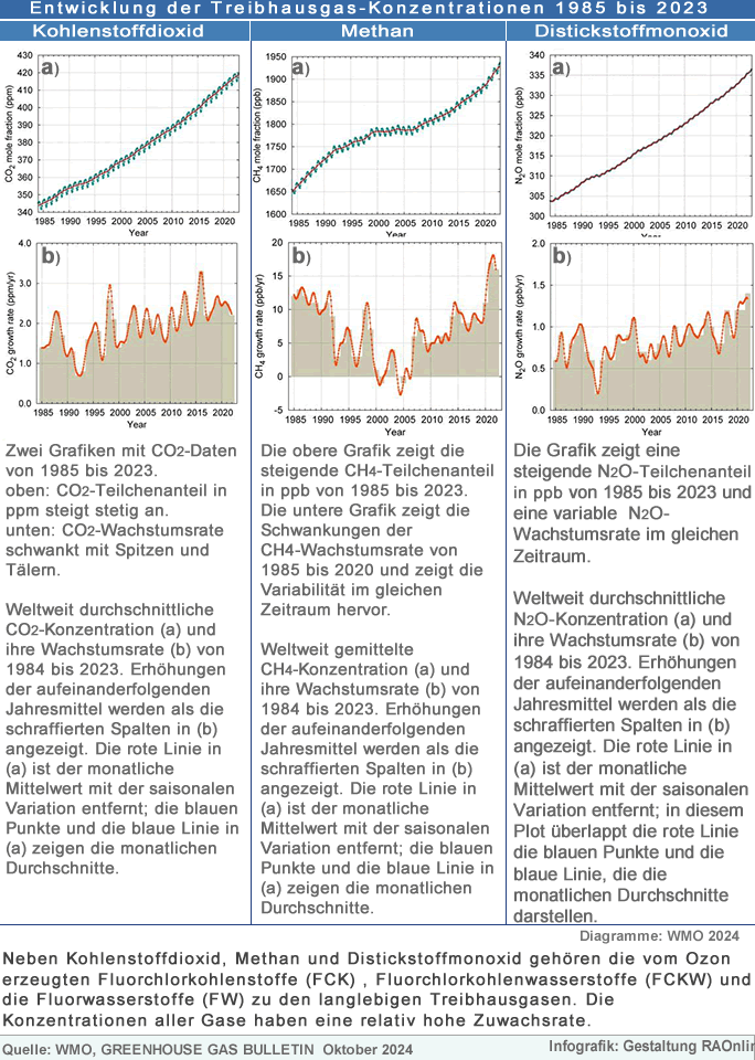 Der Treibhausgaskonzentration stieg im Jahr 2023 auf einen neuen Rekord und veursacht dadurch auf unserem Planeten für viele Jahre weiter steigendn Temperaturen, so ein Bericht der Weltorganisation für Meteorologie (WMO). Kohlendioxid (CO2) sammelt sich in der Atmosphäre schneller an als jemals zuvor während der menschlichen Existenz und steigt in nur zwei Jahrzehnten um mehr als 10%. Die wichtigsten Erkenntnisse ● Die CO2-Konzentrationen sind in nur 20 Jahren um 11,4 % gestiegen. Im Laufe des Jahres 2023 wurden grosse CO2-Emissionen von Vegetationsfeuern und eine mögliche Reduzierung der Kohlenstoffabsorption durch Wälder in Kombination mit hartnäckig hohen fossilen Brennstoffen CO2-Emissionen aus menschlichen und industriellen Aktivitäten zur Förderung des Anstiegs erreicht, so das jährliche Treibhausgas-Bulletin der WMO. Die weltweit gemittelte Oberflächenkonzentration von CO2 erreichte 420,0 Teile pro Million (ppm), Methan 1'934 Teile pro Milliarde und Lachgas 336,9 Teile pro Milliarde (ppb) im Jahr 2023. Diese Werte sind 151%, 265% und 125% der vorindustriellen (vor 1750) Niveaus, sagte es. Diese werden auf Basis der Langzeitbeobachtungen innerhalb des Global Atmosphere Watch-Netzwerks von Überwachungsstationen berechnet. "Ein weiteres Jahr. Noch ein Rekord. Dies sollte die Alarmglocken unter den Entscheidungsträgern läuten lassen. Wir sind eindeutig vom Weg abgekommen, um das Ziel des Pariser Klima-Abkommenszu erreichen, die globale Erwärmung auf deutlich unter 2 ° C zu begrenzen und 1,5 °C über dem vorindustriellen Niveau zu erreichen. Das sind mehr als nur Statistiken. Jeder Teil pro Million und jeder Bruchteil eines Grades Temperaturanstieg hat einen echten Einfluss auf unser Leben und unseren Planeten“, sagte WMO-Generalsekretärin Celeste Saulo. Der Anstieg von CO2 in der Atmosphäre im Jahr 2023 war höher als der von 2022, obwohl niedriger als der der drei Jahre davor. Der jährliche Anstieg von 2,3 ppm markierte das zwölfte Jahr in Folge mit einem Anstieg von mehr als 2 ppm. Das WMO Greenhouse Gas Bulletin (Treibhausgas-Bulletin) ist eine der Publikationen der WMO, die veröffentlicht wurden, um die UN-Klimakonferenz COP zu informieren, und befindet sich nun in der zwanzigsten Ausgabe. In dieser Zeit ist der CO2-Wert um 11,4 % (42,9 ppm) über das Niveau von 377,1 ppm gestiegen, das 2004 vom Global Atmosphere Watch-Netzwerk der WMO-Überwachungsstationen verzeichnet wurde. Das Greenhouse Gas Bulletin berichtet über Treibhausgaskonzentrationen und nicht über Emissionswerte. Die Analyse der Daten zeigt, dass knapp die Hälfte der CO2-Emissionen in der Atmosphäre verbleiben. Etwas mehr als ein Viertel werden vom Ozean absorbiert und knapp 30% von Landökosystemen - obwohl es aufgrund von natürlich vorkommenden Phänomenen wie El Niño und La Niña eine beträchtliche Variabilität von Jahr zu Jahr gibt. Das Greenhouse Gas Bulletin ergänzt den Emissionslückenbericht des UN-Umweltprogramms. Beide wurden vor der COP29 in Baku, Aserbaidschan, veröffentlicht. Während der Jahre von El Niño neigen die Treibhausgase dazu zu steigen, weil trockenere Vegetation und Waldbrände die Effizienz von Kohlenstoffsenken reduzieren. "Das Bulletin warnt davor, dass wir einem potenziellen Teufelskreis gegenüberstehen. Natürliche Klimavariabilität spielt eine grosse Rolle im Kohlenstoffkreislauf. Aber in naher Zukunft könnte der Klimawandel selbst dazu führen, dass Ökosysteme zu grösseren Quellen für Treibhausgase werden. Waldbrände könnten mehr CO2-Emissionen in die Atmosphäre freisetzen, während der wärmere Ozean weniger CO2 absorbieren könnte. Folglich könnte mehr CO2 in der Atmosphäre bleiben, um die globale Erwärmung zu beschleunigen. Diese Klima-Feedbacks sind kritische Anliegen für die menschliche Gesellschaft“, sagte der stellvertretende Generalsekretär der WMO, Ko Barrett. Von 1990 bis 2023 stieg der Strahlungsantrieb - die Erwärmungswirkung auf unser Klima - durch langlebige Treibhausgase um 51,5%, wobei CO2 etwa 81% dieses Anstiegs ausmachte, so der jährliche Treibhausgasindex der National Oceanic and Atmospheric Administration, der im WMO Bulletin zitiert wird. Solange die Emissionen anhalten, werden sich die Treibhausgase in der Atmosphäre weiter ansammeln, was zu einem globalen Temperaturanstieg führt. Angesichts der extrem langen Lebensdauer von CO2 in der Atmosphäre wird das bereits beobachtete Temperaturniveau noch mehrere Jahrzehnte anhalten, auch wenn die Emissionen schnell auf Netto-Null reduziert werden. Das letzte Mal, dass die Erde eine vergleichbare Konzentration von CO2 erlebte, war vor 3-5 Millionen Jahren, als die Temperatur 2-3 ° C wärmer war und der Meeresspiegel 10-20 Meter höher war als jetzt. Kohlendioxid CO2 ist das wichtigste Treibhausgas in der Atmosphäre, das mit menschlichen Aktivitäten zusammenhängt und etwa 64% der Erwärmungswirkung auf das Klima ausmacht, hauptsächlich aufgrund der Verbrennung fossiler Brennstoffe und der Zementproduktion. Der Anstieg von CO2 in der Atmosphäre im Jahr 2023 war höher als der von 2022, obwohl niedriger als der der drei Jahre davor. Der jährliche Anstieg von 2,3 ppm markierte das zwölfte Jahr in Folge mit einem Anstieg von mehr als 2 ppm, während der Anstieg innerhalb des Jahres 2023 einer der grössten war (2,8 ppm). Der langfristige CO2-Anstieg ist auf die Verbrennung fossiler Brennstoffe zurückzuführen, aber es gibt von Jahr zu Jahr Schwankungen aufgrund der El Niño-Southern Oscillation (ENSO), die sich auf die Aufnahme von Photosynthese-CO2-Emissionen, die Entlassung der Atemwege und die Brände auswirkt. Im Mai 2023 wechselte die Erde von einer 3 Jahre langen La Niña-Phase in eineEl Niño-Phase. Im Jahr 2023 lagen die weltweiten Brand-CO2-Emissionen um 16 % über dem Durchschnitt, der siebte Platz unter allen Brandsaisons seit 2003. Kanada erlebte seine schlimmste Waldbrandsaison seit Beginn der Aufzeichnungen. Australien erlebte seinen trockensten D