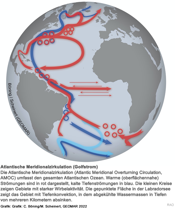| Südlich und östlich von Grönland taucht kaltes und aufgrund seines hohen Salzgehalts schweres Wasser ab und strömt in der Tiefe gen Süden. In der Gegenrichtung fliesst warmes Wasser an der Meeresoberfläche aus den Tropen gen Norden. Fachleute bezeichnen diese den gesamten Atlantik umspannende Umwälzbewegung als Atlantische Meridionale Umwälzzirkulation (Atlantic Meridional Overturning Circulation, AMOC). |