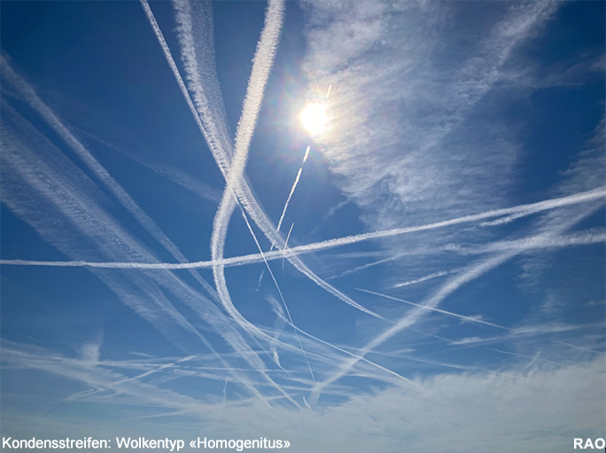 | Zu den «Homogenitus»-Wolken gehören Wolkengebilde, welche durch menschliche Aktivitäten erzeugt wurden. Dazu gehören auch die von den Flugzeugen erzeugten Kondensstreifen (Cirrus Homogenitus). «Homogenitus»-Wolken sind auch die Nebelfahnen über den Kühltürmen von Kernkraftwerken oder über den Kaminen von Kehrichtverbrennungsanlagen. |