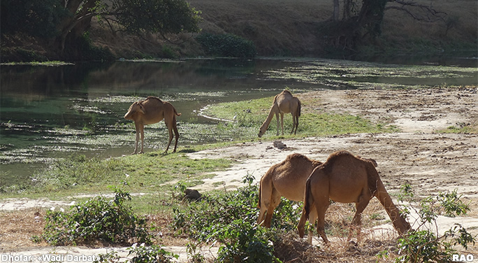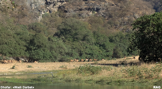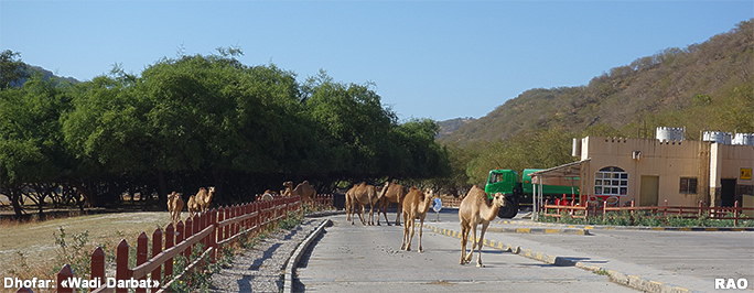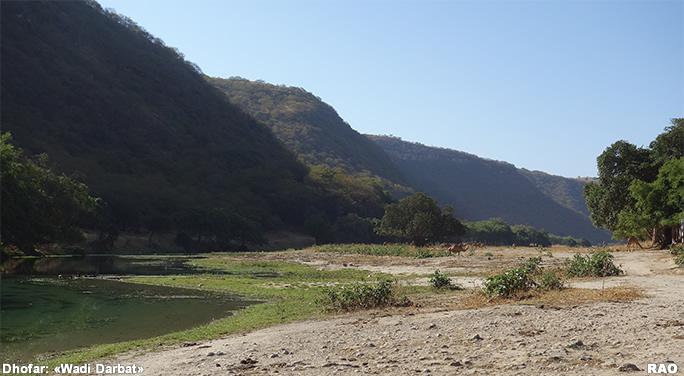 Das Quellwasser aus dem Wadi Darbat fliesst gegen Süden und stürzt als Wasserfall über eine Kalksteinwand. Später nach dem unterqueren der Autobahn, welche von Salalah nach Mirbat führt, bildet der Fluss aus dem Wadi Darbat den Süsswasserarm Khor Rori (Kawar Rawri) mit seinem Wildschutzgebiet. Über diesem Süsswasserzufluss befindet sich die Überrest der vorislamischen Stadt Sumhuram. Diese Stadt erlebte mit ihrem Handelshafen für u.a. Weihrauchprodukte im 4. und 5. Jhd. n. Chr. ihre Hochblüte.