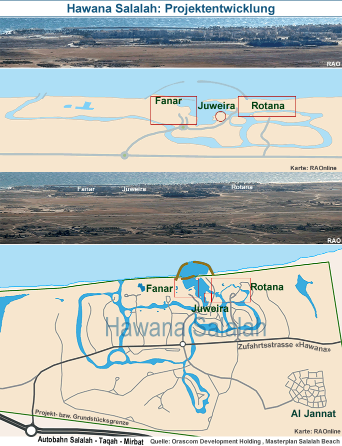 2012 wurde am damals noch sogenannten «Salalah Beach» das Marina Boutique Hotel «Juweira» eröffnet. Danach ging es Schlag auf Schlag. Ab 2014 empfing das «Salalah Rotana Resort» seine Gäste und ab Ende 2015 das «Fanar Hotel & Residences».Gleichzeitig wurden Bereiche der drei Hotels schrittweise eine Marina mit weiteren Gebäuden wie u.a. Restaurants, Shops, Suiten und Appartements sowie eine Lagunenlandschaft mit zahlreichen Villen gebaut.