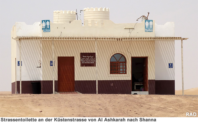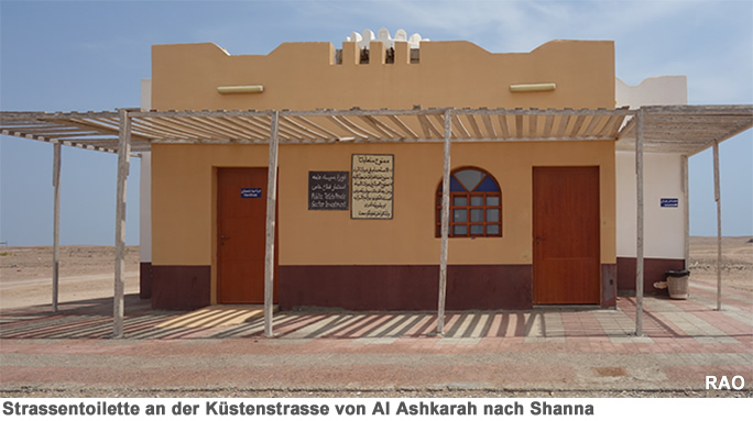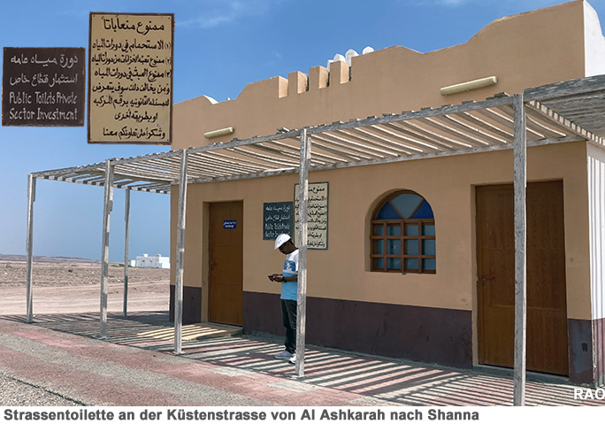 Die Toilettenanlagen mit separaten Eingängen für Frauen, für Männer und behinderte Menschen bestechen durch eine vorzügliche Sauberkeit. Auf unbewohnten Strassenabschnitten stehen immer wieder solche Häuschen. Manche Toilettenanlagen (wie jene auf den beiden Bildern oben und unten) sind tagsüber mit Reinigungspersonal besetzt.