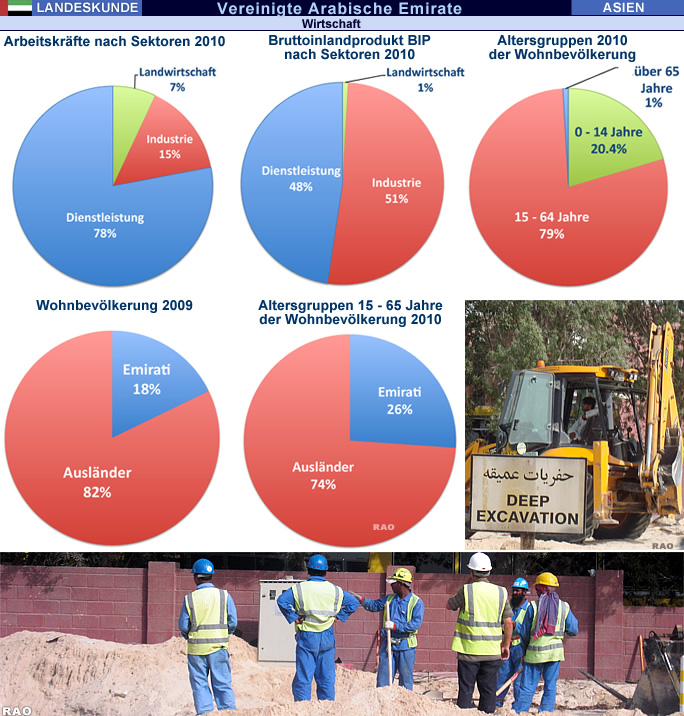 In den V.A.E. ist ein Heer von rund 4 Millionen Gastarbeitern (Quelle: MoE 2010) vor allem aus Indien, Pakistan, Bangladesh, Nepal, Indonesien und den Philippinen zu niedrigen Löhnen und mit schlechten Arbeitsbedingungen beschäftigt. Ein soziales Netz besteht für diese Arbeitskräfte nicht. Wer kein Arbeitsverhältnis hat, muss in einer sehr kurzen Frist das Land wieder verlassen. Familiennachzug ist nur unter ganz klar umschriebenen Bedingungen möglich. In der letzten Zeit haben immer mehr gut ausgebildete Menschen aus Osteuropa eine Anstellung in mittleren und oberen Kaderfunktionen in den Emiraten gefunden.
