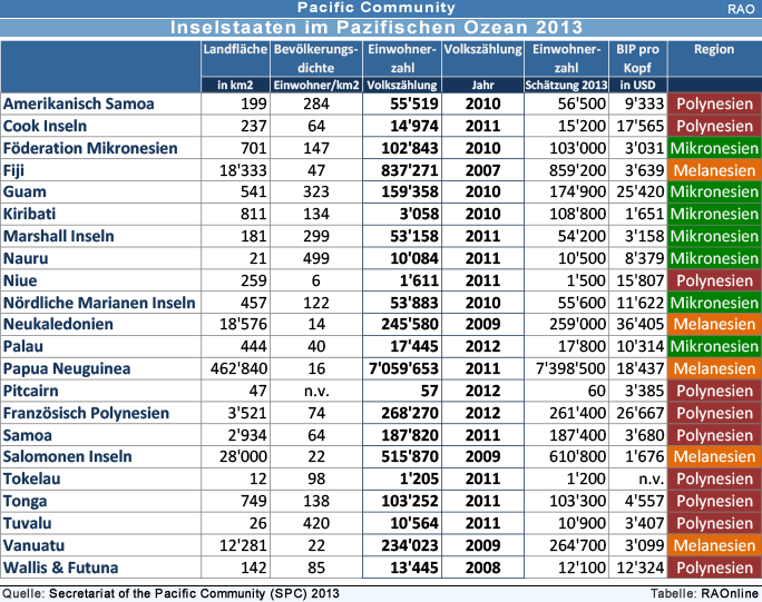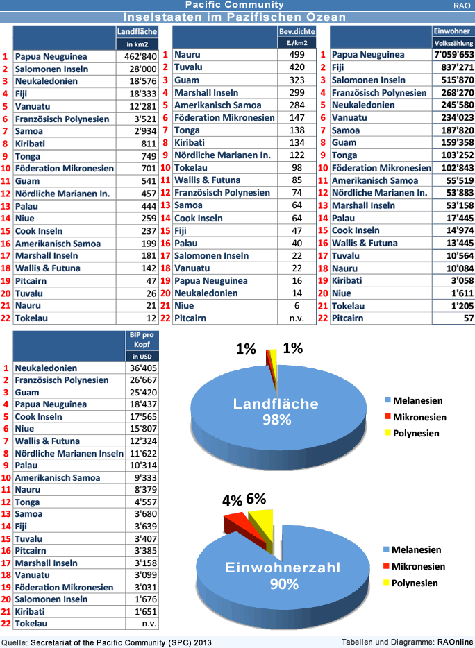 Bevölkerung, Cook Islands, Kiribati, Marshall Inseln, Nauru, Melanesien, Mikronesien, Polynesien, Salomonen Inseln, Statistik ,Tonga, Tuvalu, Vanuatu, Tokelau, Niu, Samoa, Amerikanisch Samoa, Papua-Neuguinea, Föderation Mikronesien ,Palau, Pitcairn, Marianen, Neukaledonien, Guam, Wallis und Futuna, Französisch Polynesien, Landfläche, Bevölkerungszahl, Bevölkerungsdichte, Bruttoinlandprodukt |