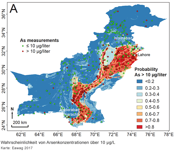 In den dicht besiedelten Ebenen entlang des Indus und seiner Zuflüsse liegen die Arsenkonzentrationen im geförderten Grundwasser vielerorts über dem Grenzwert der Weltgesundheitsorganisation WHO von 10 µg/Liter. Sehr hohe Werte, über 200 µg/Liter, finden sich vor allem im Süden; der höchste für diese Studie gemessene betrug 500 µg/Liter. |