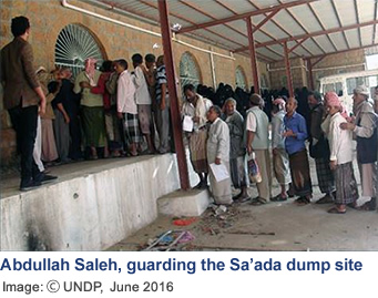 With the head of the Cleaning Fund, the entity in charge of managing solid waste, we approach the largest dump site of Sa'ada City. The effect of qat, a leafy narcotic that is daily consumed and packaged in plastic bags, is detectable even here. We stumble across medical waste, animal carcasses and countless tons of plastic. The dump site neighbours a university. UNDP is providing spare parts to the Cleaning Fund to rehabilitate its fleet of vehicles and hired 250 youth for two months to clean up waste and debris from the streets under a cash-for-work programme. Yet it is clear that the needs are immense, as the Cleaning Fund is under-resourced to achieve its mandate. "We need new machines, new trucks, more garbage containers to keep the city clean", explained Mohammed Albadani from the Cleaning Fund, "the trucks are as old as my grandmother", he added. Abdullah Saleh, guardian of the dump site since three years ago leaves us, away between looming hills of waste.