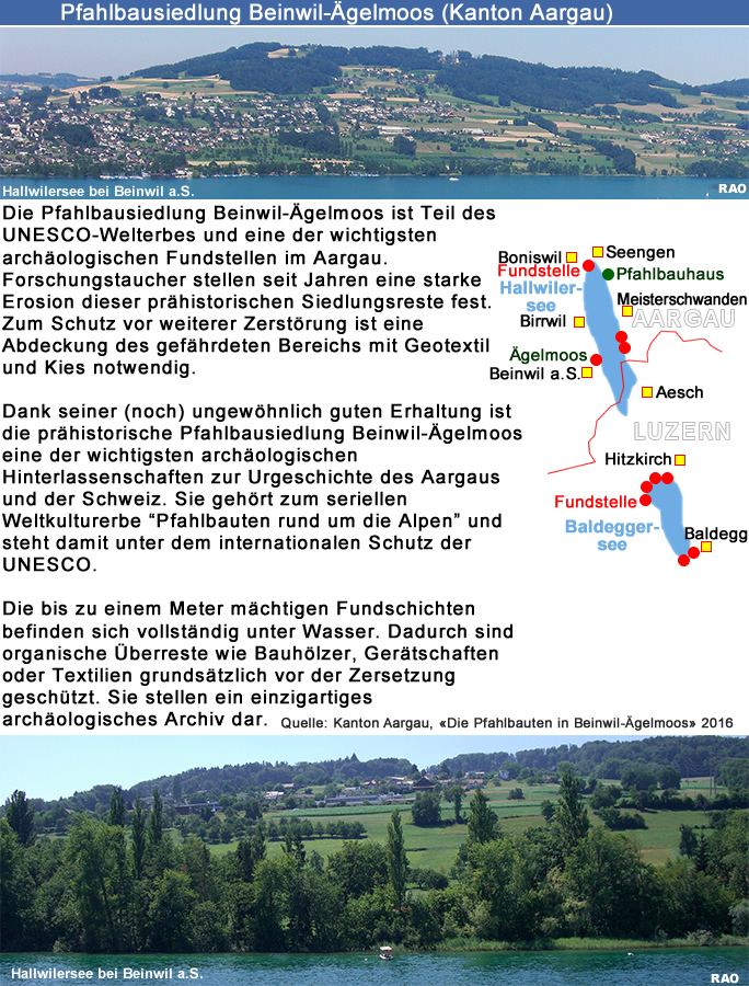 | Die archäologische Fundstelle am Hallwilerseeufer wurde mit einer Schutzschicht abgedeckt. Die Fundstelle ist weder markiert noch gibt es eine Hinweistafel. Auch für Taucher und "Gewundrige" gibt es weder über noch unter der Wasseroberfläche irgend etwas Archäologisches zu erkunden. Archäologische Funde gehören grundsätzlich dem Staat. Wer Fundstücke ansich nimmt, macht sich strafbar. |