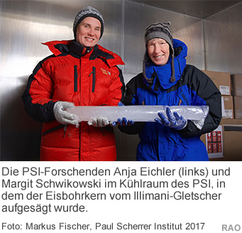 | Das Eis eines Gletschers ist im Prinzip eine Art Archiv; in seiner Schichtung sind wie in den Jahresringen eines Baums die regionale Klimaentwicklung und Luftqualität der Vergangenheit gespeichert. Jedes Jahr kommt eine neue Schicht gefrorener Niederschlag obendrauf. Und jedes Mal werden Staubteilchen eingelagert, die zu jener Zeit durch die Luft schwebten. Bohrt man also tief in den Gletscher hinein und zieht eine lange Säule Eis heraus, kann man sie vorsichtig und unter Kühlung in ein Labor bringen und untersuchen. Und so nahm sich das Team um Studien-Erstautorin Anja Eichler und Projektleiterin Margit Schwikowski einen 139 Meter langen Eisbohrkern vor, der 1999 während einer Expedition in rund 6'300 Metern Höhe auf dem Illimani-Gletscher in Bolivien gebohrt wurde, und analysierten speziell die Ablagerungen von Metallstaub. |