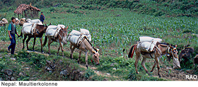 Ähnlich wie die Alpenbewohner haben die Menschen im Himalaja viele der Arbeits- und Handelswege mit Steinen befestigt und stabilisiert. Dieser Ausbau sorgt dafür, dass die Wege auch während regenreichen Zeiten sicher begangen werden können.