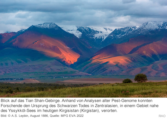 Doch woher kam dieser Stamm? Entwickelte er sich lokal oder wurde er in die Region eingeschleppt und breitete sich dann aus? Die Pest ist keine Krankheit, die im Menschen ihren Ursprung hat; das Bakterium Y. pestis überlebt in wilden Nagetierpopulationen auf der ganzen Welt - in so genannten Pestreservoirs. Der alte zentralasiatische Stamm, der die Epidemie von 1338 bis 1339 am Yssykköl-See verursachte, muss also aus einem solchen Reservoir stammen. "Moderne, mit dem alten Stamm am engsten verwandte Stämme finden wir heute in Pestreservoirs rund um das Tian Shan-Gebirge, also ganz in der Nähe des Fundortes dieses alten Stammes. Der Vorfahre des Schwarzen Todes scheint also in Zentralasien entstanden zu sein", erklärt Johannes Krause, Hauptautor der Studie und Direktor am Max-Planck-Institut für evolutionäre Anthropologie.