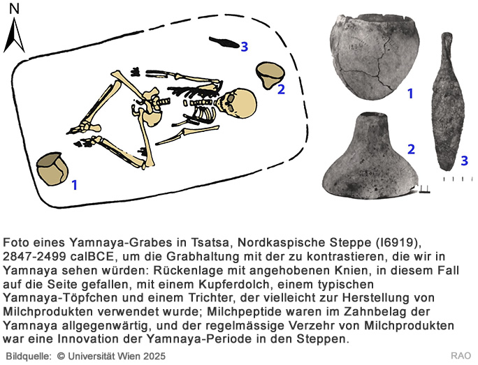 In der neuen Studie, an der auch Tom Higham und Olivia Cheronet von der Universität Wien beteiligt sind, analysierten die Wissenschafterinnen und Wissenschaftlerinnen die DNA von 435 Individuen aus archäologischen Stätten in ganz Eurasien aus der Zeit zwischen 6'400 und 2'000 v.d.Z. Frühere genetische Studien hatten gezeigt, dass sich die Yamnaya-Kultur (3'300-2'600 v.d.Z.) beginnend 3'100 v.d.Z. aus den pontisch-kaspischen Steppen nördlich des Schwarzen und Kaspischen Meers sowohl nach Europa als auch nach Zentralasien ausbreitete, die das Auftreten von "Steppenvorfahren" in menschlichen Populationen in ganz Eurasien zwischen 3'100-1'500 v.d.Z. erklären. Diese Migrationen aus den Steppen hatten von allen demografischen Ereignissen der letzten 500 Jahre die grössten Auswirkungen auf das Genom des europäischen Menschen und werden weithin als wahrscheinliche Träger für die Verbreitung der indoeuropäischen Sprachen angesehen.