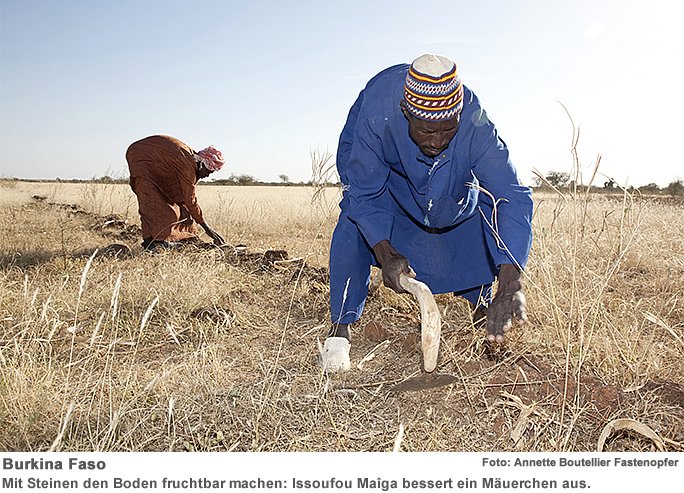 | In der Sahelzone gibt es keine Humusschicht, welche die Feuchtigkeit des Bodens bewahrt. Die seltenen Niederschläge sind stark und heftig. Statt im Boden zu versickern, schwemmt das Wasser die dünne Erdschicht weg. Um dem Abhilfe zu verschaffen, lernen die Bauernfamilien, um ihre Felder herum kleine Steinmäuerchen zu bauen. So wird das Wasser zurückgehalten und versickert langsam im Boden. So wird die Erde fruchtbar.