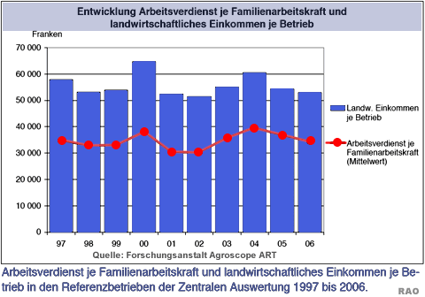 Die Resultate des Landwirtschaftsjahres 2006 liegen tiefer als im Vorjahr. Sowohl der Arbeitsverdienst je Familienarbeitskraft als auch das landwirtschaftliche Einkommen je Betrieb gehen zurück. Dies zeigen die definitiven Ergebnisse der Referenzbetriebe der Zentralen Auswertung von Buchhaltungsdaten der Forschungsanstalt Agroscope Reckenholz-Tänikon ART. Der Arbeitsverdienst je Familienarbeitskraft liegt im Jahr 2006 bei 34 500 Franken gegenüber 36 700 Franken im Jahr 2005. Das landwirtschaftliche Einkommen je Betrieb beträgt 52 900 Franken gegenüber 54 300 Franken im Vorjahr. Zusammenfassend liegt dies daran, dass 2006 die gesamte Rohleistung je Betrieb leicht zurückgeht und gleichzeitig die Kosten etwas höher liegen als im Vorjahr. Die Referenzbetriebe bewirtschaften im Mittel 20 Hektaren landwirtschaftliche Nutzfläche mit 1,24 familieneigenen Arbeitskräften.