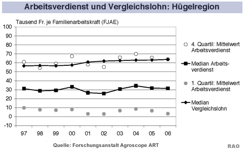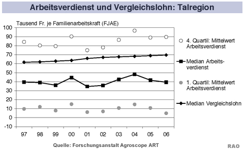 Nicht nur zwischen den Regionen, sondern auch innerhalb einer Region sind die Unterschiede sehr gross. Die Analyse der Streuung zeigt beträchtliche Differenzen zwischen dem Viertel der Betriebe mit den tiefsten Arbeitsverdiensten je Familienarbeitskraft (1. Quartil) und dem Viertel mit den höchsten Arbeitsverdiensten (4. Quartil). Während in der Talregion die mittleren Arbeitsverdienste des 4. Quartils über dem Vergleichslohn liegen, wird dieser in der Hügelregion knapp erreicht oder leicht übertroffen. In den Jahren 2003 bis 2006 erreicht auch in der Bergregion der mittlere Arbeitsverdienst des besten Viertels der Betriebe das Niveau des entsprechenden Vergleichslohns. Der