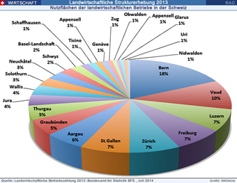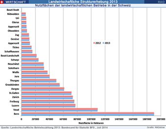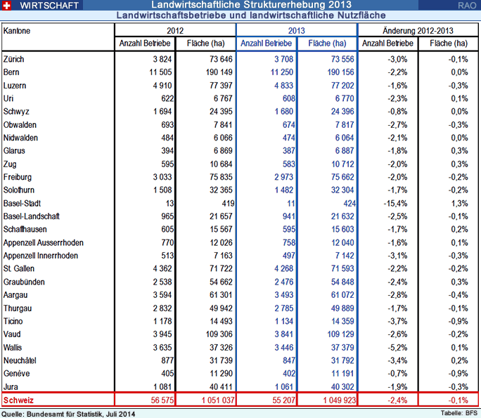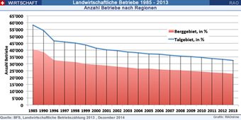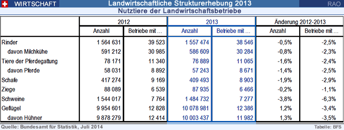 Gemäss den jüngsten Ergebnissen des Bundesamtes für Statistik (BFS) hat die Anzahl der Landwirtschaftsbetriebe im Jahr 2013 weiter abgenommen und belief sich auf 55'207 Einheiten (-2,4% im Vergleich zum Vorjahr). Die landwirtschaftliche Nutzfläche blieb hingegen stabil (-0,1%). Die Zahl der Beschäftigten in der Landwirtschaft (mehrheitlich Familienmitglieder) nahm im Vergleich zum Jahr 2012 um 1,9 Prozent ab. Die tierische Produktion zeichnete sich durch eine Zunahme des Geflügelbestands, eine Stabilisierung des Rindviehbestands und einen Rückgang des Schweinebestands aus.