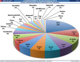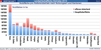 | Im Jahr 2013 zählte die Schweiz 55'207 Landwirtschaftsbetriebe, was einem Rückgang um 2,4 Prozent im Vergleich zum Jahr 2012 entspricht.