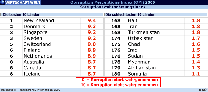 Keine Entwarnung für Industriestaaten Die höchste Punktzahl im CPI 2009 haben Neuseeland (9,4 Punkte), Dänemark (9,3), Singapur (9,2), Schweden (9,2) und die Schweiz (9,0). Dies zeugt von politischer Stabilität, einer langen Tradition von Konfliktlösungsmechanismen und soliden politischen Institutionen. Doch die Industrieländer, insbesondere die Finanzzentren, in denen durch Korruption erlangte Gelder versteckt werden können (sog. Schattenfinanzzentren), dürfen sich nicht zurücklehnen. Gerade sie unterminieren die weltweiten Anstrengungen zur Korruptionsbekämpfung undRückerlangung illegal erworbenen Vermögens. Huguette Labelle, Vorsitzende von Transparency International: "Geld aus Korruptionsdelikten darf keinen sicheren Hafen finden. Es ist an der Zeit, den Ausreden ein Ende zu setzen. Wir begrüssen die Anstrengungen der OECD in diesem Bereich,aber wir fordern mehr bilaterale Verträge zum Informationsaustausch, um die Geheimhaltung vollständig zu beenden." Gerade in Industrieländern haben häufig die an korrupten Geschäften beteiligten Unternehmen ihren Sitz. Daher muss auch Deutschland seine Anstrengungen verstärken, Korruption konsequent und wirksam zu bekämpfen. Deutschland ist unverändert auf Platz 14 (8,0 Punkte; Vorjahr: Platz 14 - 7,9 Punkte) und befindet sich damit im Mittelfeld von vergleichbaren Staaten. Welche Hoffnungen für die Korruptionsprävention und -bekämpfung in Deutschland bestehen, kann ein Blick in den Koalitionsvertrag zwischen CDU, FDP und CSU zeigen. Während das Stichwort "Transparenz" zwanzig Mal an den verschiedensten Stellen im Koalitionsvertrag auftaucht, ist von "Korruption" kaum die Rede. Der Begriff taucht vor allem im Hinblick auf Afghanistan und die Entwicklungsländer auf. Sylvia Schenk, Vorsitzende von Transparency Deutschland: "Wir begrüssen die Bedeutung, die der Transparenz inzwischen beigemessen wird, nachdem die Wirtschaftskrise ja auch auf einen Mangel an Transparenz zurückzuführen ist. Allerdings genügen Worte, insbesondere an andere Länder gerichtet, schon lange nicht mehr - es müssen Taten folgen. Deutschland trägt als führende Exportnation und politisches Schwergewicht eine besondere Verantwortung weltweit. Wir haben Handlungsbedarf im Strafrecht, beim Thema Anti-Korruptionsregister und dem Schutz von Hinweisgebern." Zu diesen Punkten findet sich nichts im Koalitionsvertrag. Damit bleibt auch offen, ob das Parlament endlich durch Verschärfung des Tatbestandes der Abgeordnetenbestechung (§ 108 e StGB) die Voraussetzungen für die Ratifizierung der UN-Konvention gegen Korruption (UNCAC) schaffen wird. Konkret finden sich Ansatzpunkte für eine wirksamere Korruptionsprävention im Koalitionsvertrag beim Arbeitnehmerdatenschutz, dem mehr Gewicht eingeräumt und zugleich den Arbeitgebern eine verlässliche Regelung für den Kampf gegen Korruption an die Hand gegeben werden soll. Ausserdem soll die Transparenz der Entscheidungen kommunaler Gesellschaften erhöht und im Bereich Vergabe im sogenannten Unterschwellenbereich verstärkt werden. Enttäuschendes Ergebnis der Vertragsstaatenkonferenz Enttäuschend war für Transparency der Abschluss der 3. Konferenz der Vertragsstaaten der UN-Konferenz gegen Korruption (UNCAC) in Doha (Katar) am vergangenen Freitag. Der dort beschlossene Überwachungsmechanismus für die Umsetzung der Konvention überlässt es den geprüften Ländern selbst, inwieweit sie Länderbesuche der Prüfgruppen, Gespräche mit Organisationen der Zivilgesellschaft und die Veröffentlichung des Länderberichts zulassen. Deutschland hatte an der Konferenz nur als Beobachter teilgenommen, da einer UNCAC-Ratifizierung durch Deutschland die unzureichende Regelung des Straftatbestandes der Abgeordnetenbestechung (§108e, StGB) entgegensteht. 141 Länder weltweit haben die Konvention bereits ratifiziert.