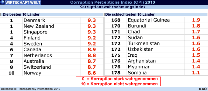 Der Korruptionswahrnehmungsindex (Corruption Perceptions Index CPI) der Antikorruptionsorganisation Transparency International misst den Grad der wahrgenommenen Korruption im öffentlichen Sektor. Drei Viertel der 178 untersuchten Länder erzielt auf einer Skala von null (als sehr korrupt wahrgenommen) bis zehn (als wenig korrupt wahrgenommen) weniger als fünf Punkte. Korruption bleibt damit weltweit ein ernst zu nehmendes Problem. Die Schweiz fällt im Vergleich zu den Vorjahren um 0.3 Punkte zurück. Dänemark, Neuseeland und Singapur teilen sich mit einer Punktzahl von 9.3 den ersten Platz. Die unteren Ränge des CPI belegen Länder mit instabilen Regierungen, die häufig unter den Folgen eines Konflikts leiden. Afghanistan und Myanmar teilen sich den vorletzten Platz mit einer Punktzahl von 1.4. Somalia belegt mit einer Punktzahl von 1.1 den letzten Rang. Huguette Labelle, Vorsitzende von Transparency International, äussert sich zum diesjährigen CPI: "Dieses Ergebnis zeigt, dass bedeutend mehr unternommen werden muss, um Regierungsführung weltweit zu stärken. Die Existenzgrundlage vieler Menschen steht auf dem Spiel. Regierungen müssen ihren Bekenntnissen zu Korruptionsbekämpfung, Transparenz und Rechenschaftspflicht Taten folgen lassen. Gute Regierungsführung muss ein integraler Bestandteil globaler Lösungen sein." Antikorruptionsmassnahmen müssen in allen Bereichen implementiert werden. Dies gilt ins-besondere für die Finanzmarktreform, den Kampf gegen den Klimawandel und die Verpflichtung der internationalen Gemeinschaft, der weltweiten Armut zu begegnen. Transparency fordert daher eine strengere Umsetzung der UN-Konvention gegen Korruption (UNCAC). Die UNCAC ist ein wichtiges globales Regelwerk zur Bekämpfung von Korruption. Huguette Labelle: "Wir dürfen Korruption nicht einfach hinnehmen, denn zu viele arme und schwache Menschen leiden weltweit an ihren Folgen. Die Umsetzung bestehender Regelungen und Gesetze muss verbessert werden, um Korruption den Nährboden zu entziehen."