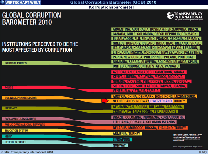 Die Auswirkungen der Finanzkrise Auffällig ist, dass einige Länder, die besonders von der Finanzmarktkrise betroffen waren, im CPI abgerutscht sind. Diese Krise wurde letztendlich auch durch mangelnde Transparenz und Integrität herbeigeführt. Zudem hat sich kein einziger OECD-Mitgliedstaat im Vergleich zum Vorjahr verbessert. Alle Länder sind dementsprechend aufgefordert, ihre Bemühungen im Kampf gegen Korruption zu verstärken. Huguette Labelle: "Die Ergebnisse des diesjährigen Korruptionswahrnehmungsindex zeigen erneut, dass Korruption ein weltweites Problem ist, mit dem sich politische Reformen auseinandersetzen müssen. Es ist lobenswert, dass die G20 im Rahmen der Finanzmarktreformen bereits im Vorfeld des Gipfels im November weitgehende Verpflichtungen zu Transparenz und Integrität eingegangen sind. Doch der eigentliche Reformprozess muss beschleunigt werden". Transparency International ruft die Regierungen der G20-Staaten auf, bei Reformen sowohl im öffentlichen wie im privatwirtschaftlichen Sektor staatliche Kontrolle und Transparenz walten zu lassen. Die Botschaft ist eindeutig: Überall auf der Welt sind Transparenz und Rechenschaftspflicht wesentliche Vorraussetzung, um Vertrauen wiederherzustellen und eine Kehrtwende hinsichtlich der Korruptionsbekämpfung einzuleiten. Ohne Transparenz und Rechenschaftspflicht sind politische Lösungen für eine Reihe von globalen Problemen gefährdet. Die Situation in der Schweiz Die Schweiz belegt dieses Jahr mit einem Wert von 8.7 Platz 8 des Korruptionswahrnehmungsindexes. Der diesjährige Wert ist der tiefste seit 2003; in den vergangenen 7 Jahren bewegte sich die Schweiz zwischen 8.8 und 9.1 Punkten. Die im CPI berücksichtigten Umfragen für die Schweiz wurden von 4 Institutionen durchgeführt und umfassen die Zeitspanne von Januar 2009 bis September 2010. In dieser Zeit wurden zwar keine grossen Korruptionsfälle im öffentlichen Sektor aufgedeckt, doch sind im Rahmen der damaligen Finanzkrise intransparente Zwischenfälle ans Tageslicht getreten, die das demokratische Image der Schweiz nicht begünstigt haben: