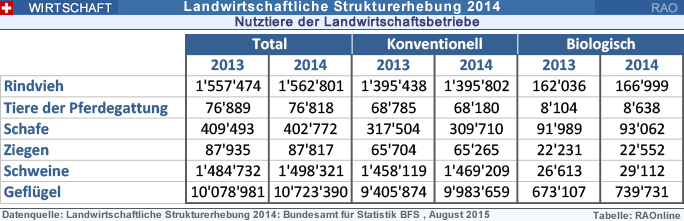 Der Rindviehbestand der Landwirtschaftsbetriebe belief sich auf 1,56 Millionen Tiere, wovon mehr als ein Drittel (38%) Milchkühe sind. Beim Schafbestand (403'000 Tiere) bestätigt sich der seit einigen Jahren beobachtete Rückgang. Der Ziegenbestand hat sich bei rund 88'000 Tieren stabilisiert. In der Geflügelzucht zeigte sich im Gegensatz dazu erneut eine Zunahme: Die Zahl der Legehühner und Mastpoulets legte gegenüber 2013 um 6,4 Prozent zu.