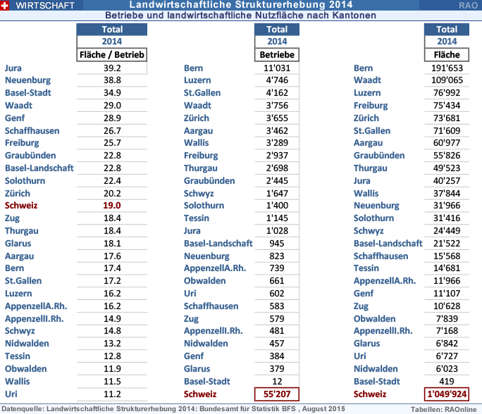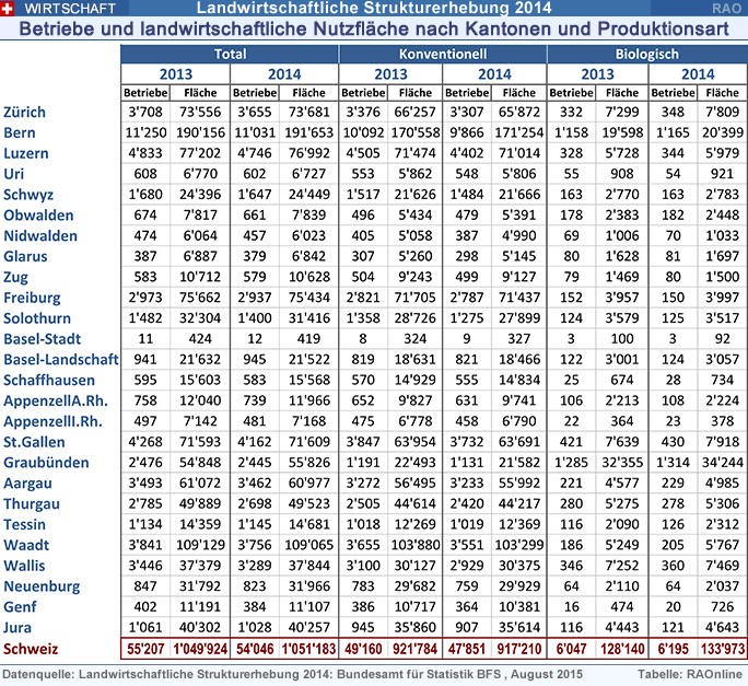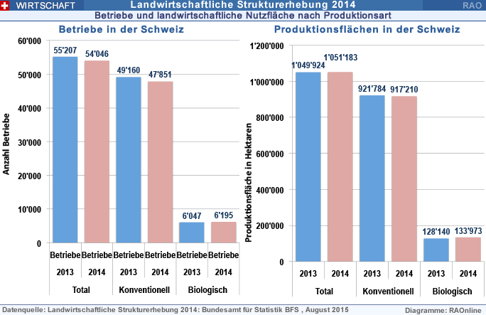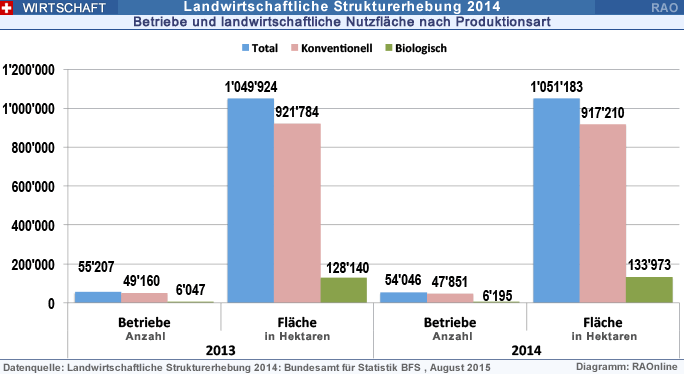 Gemäss Bundesamt für Statistik (BFS) zählte die Schweiz im Jahr 2014 etwas mehr als 54'000 Landwirtschaftsbetriebe (-2,1% gegenüber 2013). Die landwirtschaftliche Nutzfläche umfasste unverändert rund eine Million Hektaren. Die biologische Landwirtschaft legte weiter zu und macht neu über 11 Prozent aller Landwirtschaftsbetriebe aus.