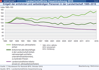 Das gesamte vom Landwirtschaftssektor im Jahr 2016 erzeugte Entgelt für die Arbeitnehmenden (Löhne und Sozialbeiträge in der Höhe von 1,3 Milliarden Franken) und für die Selbstständigerwerbenden (Nettounternehmenseinkommen oder sektorales Einkommen in der Höhe von 3,1 Milliarden Franken) beträgt 4,3 Milliarden Franken. Dies entspricht einer Zunahme von 4,0 Prozent gegenüber 2016. Der Rückgang der Anzahl Landwirtschaftsbetriebe setzt sich fort, mit einem Rückgang des landwirtschaftlichen Arbeitsvolumens um schätzungsweise 1,4 Prozent gegenüber 2016. Folglich steigt das Entgelt pro jährliche Arbeitseinheit 2016 um 5,6 Prozent, nachdem es 2016 gegenüber 2014 um 6,2 Prozent gesunken war.