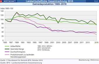 Die Produktionskosten sind weiter gesunken und 2016 um 0,8 Prozent gegenüber 2016 zurückgegangen. Der Rückgang der Erdölpreise sowie der starke Schweizer Franken im Vergleich zum Euro tragen zu dieser Kostensenkung bei. Der Preisindex sinkt bei den meisten Vorleistungsgütern sowie bei den Investitionen für Landmaschinen. Die Abschreibungen gehen weiter zurück. Langfristig trägt der Rückgang der Landwirtschaftsbetriebe zur Abnahme des landwirtschaftlichen Gebäudevolumens bei.