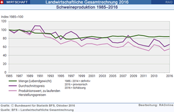 2016 hat die tierische Produktion gegenüber 2016 um 1,5 Prozent auf einen geschätzten Betrag von 5 Milliarden Franken zugenommen. Der Rückgang des Schweineangebots Anfang 2016 führte zu einer Preissteigerung; die Preise sind im Sommer jedoch wieder gesunken. Da die Preise der Schlachtschweine jedoch höher bleiben als im Vorjahr, steigt der Wert der Schweineproduktion um 8,7 Prozent. Schwierig bleiben hingegen die Bedingungen im Milchsektor, insbesondere aufgrund des tiefen Preisniveaus auf den internationalen Märkten, die durch eine globale Überproduktion aus dem Gleichgewicht geraten sind. Der Wert der Milchproduktion ist damit unter der gleichzeitigen Wirkung des Rückgangs der Preise (-1,4%) und der Mengen (-0,3%) um 1,8 Prozent gesunken. Diese Situation hat zu einer Zunahme des Angebots an Grossschlachtvieh geführt. Da die Nachfrage verhalten bleibt, wird die Wertzunahme der Rindviehproduktion auf 2,7 Prozent geschätzt.