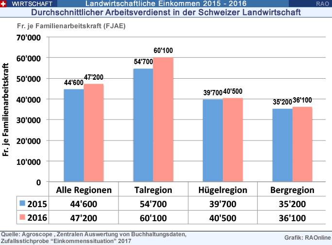 Höhere landwirtschaftliche Einkommen 2016 Das landwirtschaftliche Einkommen 2016 stieg gegenüber dem Vorjahr um 4,7 Prozent. Es betrug im Mittel 64'300 Franken je Betrieb. Hauptgründe für den Anstieg waren die höheren Preise für Schweinefleisch, die gute Weinernte sowie weniger stark gestiegene Aufwände. Diese wirkten den schlechten Ernten im Pflanzenbau und der schwierigen Situation auf dem Milchmarkt entgegen. Das ausserlandwirtschaftliche Einkommen der landwirtschaftlichen Haushalte nahm um 2,5 Prozent zu. Das Gesamteinkommen erhöhte sich damit um 4,2 Prozent. Höherer Ertrag Im Jahr 2016 betrug der mittlere Ertrag inklusive Direktzahlungen je Betrieb 317'500 Franken und stieg damit im Vergleich zum Vorjahr um 1,8 Prozent. Der Ertrag aus der Tierhaltung ist insgesamt um 1,2 Prozent gestiegen. Das lag einerseits an deutlich gestiegenen Schweinefleischpreisen, einer guten Situation auf dem Rindfleischmarkt, aber andererseits an weiterhin rückläufigen Milchpreisen. Bei den monetären Erträgen aus dem Pflanzenbau ist insgesamt ein Rückgang von 2,7 Prozent zu verzeichnen. Einerseits führten die nassen Witterungsbedingungen 2016 bei den meisten Ackerkulturen wie Getreide, Ölsaaten, Kartoffeln und Zuckerrüben zu unterdurchschnittlichen Naturalerträgen. Dagegen gab es beim Wein eine mengen- und qualitätsmässig hervorragende Ernte. Die Direktzahlungen sind bei gleichbleibendem Direktzahlungsbudget auf Bundesebene entsprechend dem Grössenwachstum der Betriebe um 1,8 Prozent gestiegen. Aufwände leicht gestiegen Der Aufwand ist bei rückläufigen Produktionsmittelpreisen um 1,1 Prozent auf 253 200Franken gestiegen. Gründe für diesen Anstieg waren höhere Personalaufwände sowie Abschreibungen und Wertberichtigungen. Höheres landwirtschaftliches Einkommen Das landwirtschaftliche Einkommen, das der Differenz von Ertrag und Aufwand entspricht, entschädigt die Familien-Arbeitskräfte und verzinst das im Betrieb investierte Eigenkapital. Es nahm durchschnittlich um 4,7 Prozent auf 64 300 Franken je Betrieb zu. In der Talregion stieg das landwirtschaftliche Einkommen um 6,9 Prozent auf 79'900 Franken. Ein Grund dafür ist, dass sich in der Talregion relativ mehr Spezialkultur- und Veredelungsbetriebe befinden. In der Hügel- und Bergregion fiel das Einkommenswachstum mit 2,0 bzw. 2,8 Prozent kleiner aus. In der Hügelregion sind die landwirtschaftlichen Betriebserträge weniger gestiegen als in der Talregion - bei gleicher Veränderung der Aufwände. In der Bergregion sind die Aufwände bei gleichbleibenden Erträgen leicht zurückgegangen. Höherer Arbeitsverdienst Der Arbeitsverdienst pro Vollzeit-Äquivalent-Familienarbeitskraft widerspiegelt die Höhe der Entschädigung der auf dem Betrieb arbeitenden Familienarbeitskräfte. Er ergibt sich, wenn man vom Landwirtschaftlichen Einkommen die Entschädigung des Eigenkapitals abzieht und durch die Anzahl Familienarbeitskräfte dividiert. Durch einen leichten Rückgang der Familienjahresarbeitseinheiten steigt der Arbeitsverdienst pro Familienarbeitskraft etwas mehr als das landwirtschaftliche Einkommen, um 5,9 Prozent auf 47'200 Franken. In der Talregion betrug er 60'100 Franken je Familienarbeitskraft in der Hügelregion 40'500 Franken und in der Bergregion 36'100 Franken. Ausserlandwirtschaftliches Einkommen leicht gestiegen Das Gesamteinkommen eines landwirtschaftlichen Haushaltes setzt sich aus dem landwirtschaftlichen und dem ausserlandwirtschaftlichen Einkommen zusammen. Es steht den Bauernfamilien für den Privatverbrauch und zur Eigenkapitalbildung zur Verfügung. Das ausserlandwirtschaftliche Einkommen wird für die Betriebsgemeinschaften nicht erhoben. Somit kann das Gesamteinkommen nur für die Einzelunternehmen ohne Betriebsgemeinschaften berechnet werden. Das ausserlandwirtschaftliche Einkommen je Betrieb ist im Jahr 2016 um 2,5 Prozent auf durchschnittlich 30'600 Franken gestiegen. Das Gesamteinkommen erreichte je Betrieb durchschnittlich 92'000 Franken und stieg damit gegenüber 2015 um 4,2 Prozent. In der Talregion beträgt das Gesamteinkommen 2016 107'600 Franken, in der Hügel- und Bergregion liegt es bei 85'000 bzw. 76'900 Franken. Der Anteil der Landwirtschaftlichen Einkommen am Gesamteinkommen ist in der Talregion mit 71 Prozent höher als in der Hügel- und Bergregion mit 61 bzw. 64 Prozent. Mittelfluss leicht gestiegen In Ergänzung zur Erfolgsrechnung gibt die Mittelflussrechnung Auskunft über die Entwicklung der liquiden Mittel der Betriebe. Der Mittelfluss des Unternehmens wird indirekt berechnet, indem vom Erfolg die nicht liquiditätswirksamen buchhalterischen Vorgänge eliminiert werden. Der Mittelfluss aus der Geschäftstätigkeit des Unternehmens lag 2016 bei 79'700 Franken. Er hat sich gegenüber dem Vorjahr um 1,6 Prozent erhöht. Dieser im Vergleich zum landwirtschaftlichen Erfolg kleinere Anstieg liegt an insgesamt höheren Abzügen für die Korrektur der nicht liquiditätswirksamen Vorgänge, zu denen beispielsweise Lagerveränderungen gehören. Auffallend ist, dass die Investitionstätigkeit der Betriebe 2016 deutlich zurückgegangen ist. Diese Entwicklungen zeigen die Ergebnisse von Agroscope, welche auf der Grundlage der Zufallsstichprobe "Einkommenssituation" der Zentralen Auswertung von Buchhaltungsdaten basieren.