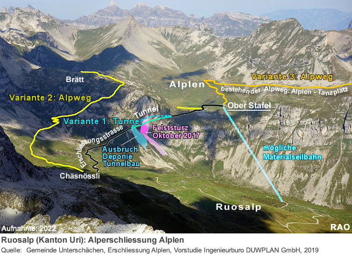 Im Rahmen einer Variantenstudie wurden 4 Möglichkeiten für die künftige Alperschliessung ausgearbeitet und überprüft. Für den Viehauf- und Viehabtrieb wurde ein Alpweg Chäsnössli über Brätt (Länge: 3,4 km) und zwei Zugangswege über Vorläubli, Mälchbödeli und Grossboden (längen: 4 km bzw. 4,3 km) in Betracht gezogen. Bei diesen Zugangsvarianten war geplant, das Material und allenfalls auch Personen mit einer Materialseilbahn von der Ruosalp hinauf zur Alp Alplen zu transportiert. Die Tunnelvariante sah vor, dass der unterbrochene und gefährliche Felsenweg in einem Tunnel umgangen würde. Der Vorteil bei der Tunnelvariante liegt darin, dass Vieh, Material und Personen auf demselben Weg zwischen der Ruosalp und Alplen zirkulieren könnten. Ausserdem dauert der Tunnelbau weniger lang als die Erstellung der neuen Alpwege und belastet die Natur- und die Kulturlandschaft weniger stark. Die wiederkehrenden, jährlichen Unterhaltskosten sind bei der Tunnelvariante wesentlich geringer als bei den übrigen geprüften Wegvarianten.