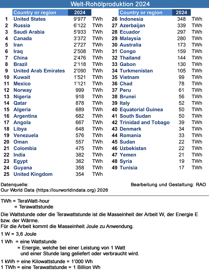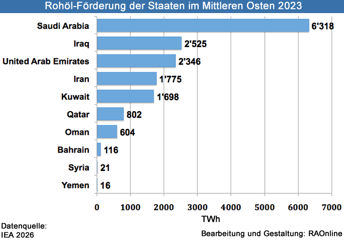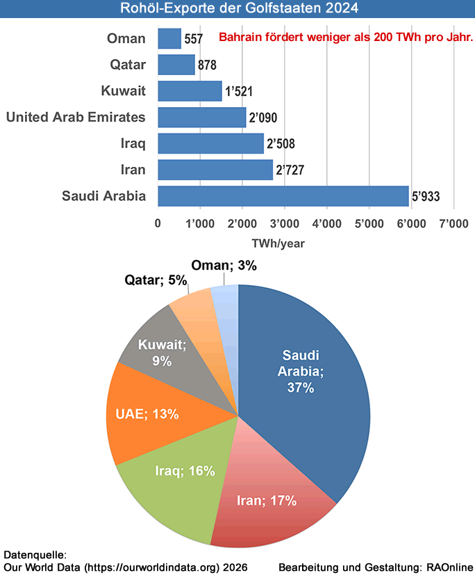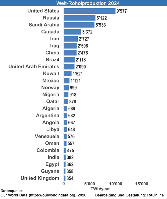 50% der Ölimporte ser Schweiz stammten 2025 aus den USA. Aus der Golfregion bezog die Schweiz 2025 kein Rohöl.
