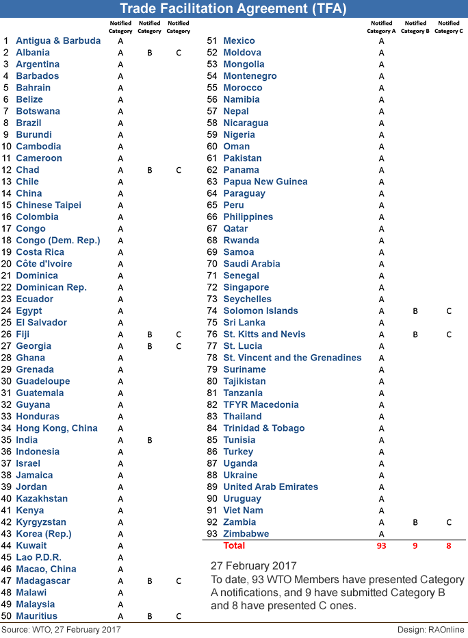 In his address to WTO members, Director-General Roberto Azevêdo said: "By ratifying the agreement, members have shown their commitment to the multilateral trading system. You have followed through on the promises made when this deal was struck in Bali. And by bringing the deal into force we can now begin the work of turning its benefits into reality." DG Azevêdo also thanked the members for their considerable efforts to reach this historic juncture. "This achievement belongs to all of you," he said. The Director-General, in his capacity as depositary of the WTO Agreements and their amendments, signed the official depositary notification of the TFA's entry into force. He handed over the notification to General Council Chair Ambassador Harald Neple (Norway) at the meeting. "The Agreement on Trade Facilitation is a defining multilateral achievement of our time," Ambassador Neple said. "It is practical, modern and global and it symbolizes the essence of the WTO: members from all corners of the globe coming together, overcoming differences and responding to pressing trade issues for the benefit of all," he said. The chair called on members who have not yet ratified the TFA to do so soon and to deposit their instruments of acceptance. All members, the chair added, must work together to fully implement the Agreement. All delegations taking the floor at the meeting—representing developed, developing and least-developed countries (LDCs)—welcomed the TFA's entry into force. Cambodia, speaking on behalf of the least-developed countries (LDC) group, said the milestone marked a very important start to members' work to achieve results in trade facilitation. Cambodia, along with several other delegations, emphasized the need of developing countries and LDCs for implementation assistance. Several delegations meanwhile echoed the chair's call for the remaining members to ratify the TFA while also offering their support for capacity building for the Agreement's implementation. Many also remarked that the TFA's entry into force demonstrated members' collaboration across various levels of development and could serve as a model for more WTO agreements in the future. The Agreement is unique in that it allows developing and least-developed countries to set their own timetables for implementing the TFA depending on their capacities to do so – and it provides for support to help them develop their capacity. The Trade Facilitation Agreement Facility (TFAF) was created at the request of developing and least-developed countries to help ensure they receive the assistance needed to reap the full benefits of the TFA and to support the ultimate goal of full implementation of the new agreement by all members. The TFA further provides for the establishment of a Committee on Trade Facilitation to periodically review the Agreement's operation and implementation. Full implementation of the TFA is forecast to slash members' trade costs by an average of 14.3 per cent, with developing countries having the most to gain, according to a 2015 study carried out by WTO economists. The TFA is also likely to reduce the time needed to import goods by over a day and a half and to export goods by almost two days, representing a reduction of 47 per cent and 91 per cent respectively over the current average. Notifications list To date, 93 WTO Members have presented Category A notifications, and 9 have submitted Category B and 8 have presented C ones.
