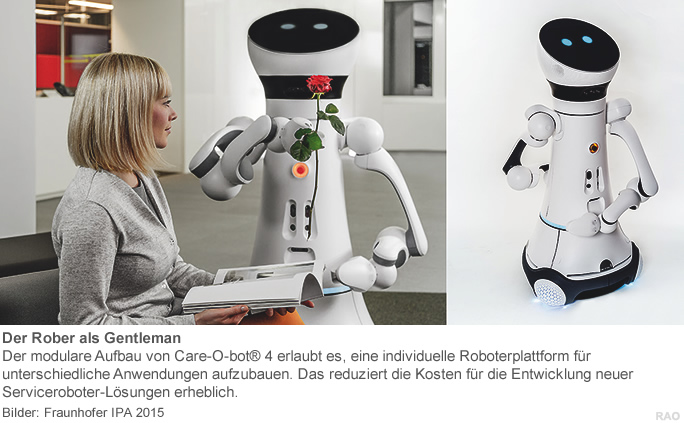 Nach dem Siegeszug des Personal Computer (PC) könnte nun bald der Personal Roboter (PR) unsere Lebens- und Arbeitswelt bereichern. Als »elektronischer Butler« könnte er die Zeitung bringen, Kaffee einschenken oder den Tisch abräumen. Er ist freundlich, sympathisch und zugleich unsichtbar, wenn man ihn nicht braucht. Seit den 1990er-Jahren entwickelt das Fraunhofer-Institut für Produktionstechnik und Automatisierung IPA innovative Serviceroboter z. B. in den Bereichen Haushalt, Hotel, Pflegeheim oder Krankenhaus. Jetzt haben die Forscher ein neues Modell eines universellen Helfers in Alltagsumgebungen entwickelt: die vierte Generation des »Care-O-bot®«. Während die Vorgänger seit 1998 primär zur Entwicklung technologischer Grundlagen genutzt wurden, bietet Care-O-bot® 4 als modulare Produktfamilie die Basis für kommerzielle Serviceroboter-Lösungen.