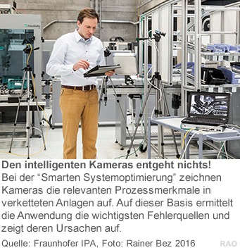 Bei kapitalintensiven Fertigungssystemen sind Unternehmen darauf angewiesen, die Produktivität stets zu maximieren. Andernfalls drohen Kostendruckund Finanzierungslücken. Klassische Methoden wie OEE-Workshops oder Wertstromanalysen kommen bei komplexen Produktionsketten jedoch schnellan ihre Grenzen. Mit der «Smarten Systemoptimierung» hat das FraunhoferIPA ein mobiles System entwickelt, das mit intelligenten Kameras echtzeitnah Daten erhebt und automatisiert auswertet. Dabei erkennt es nicht nur Prozessabweichungen und ihre Ursachen, sondern zeigt auf, welche Verluste durch die Verkettung anfallen. Erstmals zu sehen war die Anwendung auf der LogiMATvom 8. bis zum 10. März 2016 in Stuttgart.