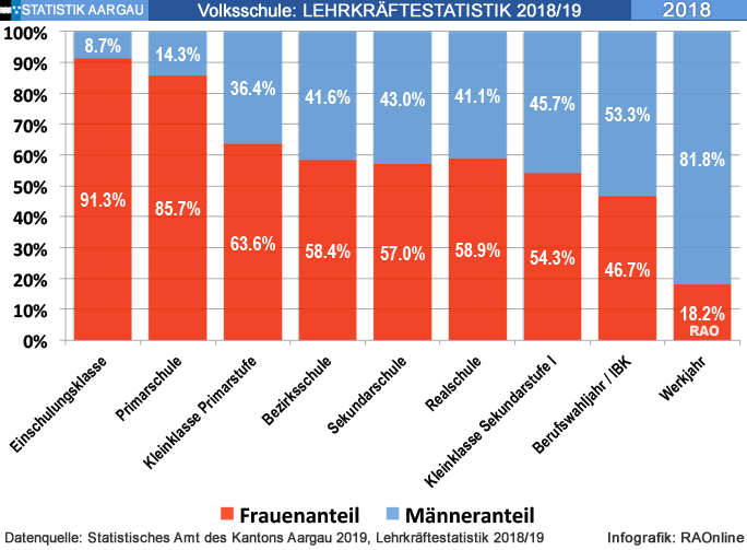 Im Schuljahr 2018/19 arbeiten an der Aargauer Volksschule 8'717 Lehrpersonen in 5'565 Vollzeitstellen (Vollzeitäquivalente). 6'811 Personen arbeiten Teilzeit (weniger als 90 Prozent eines Vollpensums), 1'906 Personen unterrichten Vollzeit (Pensum zwischen 90 und 100 Prozent). Während mehr als 80 Prozent der Frauen Teilzeit arbeiten, sind es bei den Männern knapp 66 Prozent.