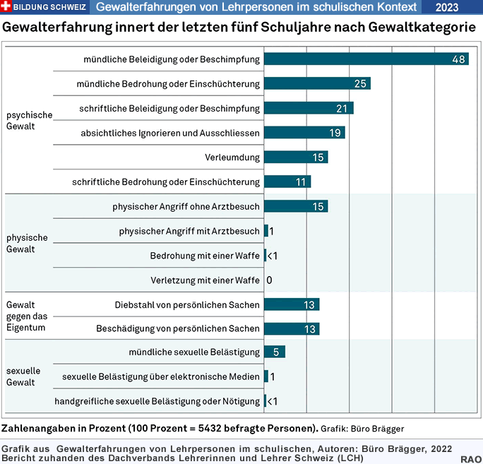 Zwei von drei Lehrpersonen haben in den vergangenen fünf Jahren Gewalt erlebt. Dies zeigt eine neue Studie des Dachverbands Lehrerinnen und Lehrer Schweiz LCH. Sie basiert auf einer repräsentativen Umfrage unter Lehrpersonen aller Stufen der Deutschschweiz. Am häufigsten sind Lehrpersonen psychischer Gewalt in Form von Beleidigungen, Beschimpfungen, Bedrohungen oder Einschüchterungen ausgeliefert. Am häufigsten geht diese von Erziehungsberechtigten aus. Aber auch Schülerinnen und Schüler üben Druck aus. Der LCH fordert präventive Massnahmen und eine bessere Unterstützung betroffener Lehrpersonen. Erstmals ist mit Fakten belegt, dass Gewalt gegen Lehrpersonen ein weitverbreitetes, ernstzunehmendes Problem in unserer Gesellschaft ist. Zwei Drittel der befragten Lehrpersonen waren in den vergangenen fünf Jahren Mobbing, Beleidigungen oder sogar physischer Gewalt ausgesetzt. Hochgerechnet auf 100'000 Lehrpersonen in der Deutschschweiz sind dies rund 65'000 betroffene Lehrpersonen. Es kann also jede Lehrperson und jede Schule treffen.