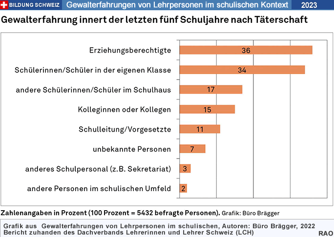 Die vier häufigsten Aggressoren Gewalt gegen Lehrpersonen geht von unterschiedlichen Aggressoren aus: • In 36 % der Fälle Erziehungsberechtigte • In 34 % der Fälle Schülerinnen und Schülern der eigenen Klasse • In 15 % der Fälle andere Lehrpersonen • In 11 % der Fälle die Schulleitung Mobbing durch Arbeitskollegen oder Vorgesetzte sind besonders belastend und können Schulhauswechsel, Kündigungen oder gar die Aufgabe des Berufs zur Folge haben. Rund 43 Prozent der Lehrpersonen waren nach einem Gewaltvorfall lange Zeit mental und emotional belastet und fühlten sich allein gelassen. Rund 75 Prozent der betroffenen Lehrpersonen schätzten hingegen die Unterstützung durch die Schulleitung als ausreichend ein. An der Umfrage der repräsentativen Studie, die das Sozialforschungsbüro Brägger für den LCH durchgeführt hat, nahmen 6700 Lehrpersonen und andere Fachpersonen aller Schulstufen aus der Deutschschweiz teil. Die Studie zeigt detailliert, welcher Art von Gewalt Lehrerinnen und Lehrer ausgesetzt sind und von wem diese ausgeht. Für den Berufsverband LCH ist die Situation besorgniserregend.