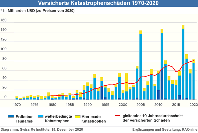 Swiss Re Institute schätzt weltweite versicherte Schäden aus Katastrophen im Jahr 2020 auf 83 Mrd. USD - die bisher fünfthöchste Jahressumme
