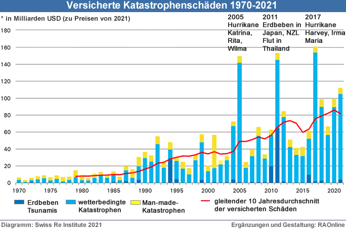 Naturkatastrophen verursachten 2021 weltweit geschätzte versicherte Schäden von 105 Mrd. USD - der vierthöchste Wert seit 1970 |