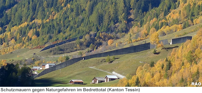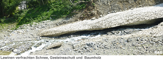 Schneelawinen Bei Schneelawinen handelt es sich um eine Naturgefahr, die primär im Gebirge droht und je nach ihrer Dimension oder der Steilheit des Geländes auch mittlere oder sogar tiefe Lagen erreicht. Grunddisposition: Die Grunddisposition für Die Entstehung von Lawinen hängt in erster Linie von der Morphologie des Terrains ab. Es braucht genügend steile Hänge (ungefähr zwischen 28°und 60°) und das Anrissgebiet weist in der Regel eine minimale Fläche (> 5'000 m2) und eine minimale Hanglänge (> 50 m) auf. Die Lawinen werden in zwei unterschiedliche Typen unterteilt: Trockenschnee- und Nassschneelawinen. Dadurch lassen sich die variable Disposition und der auslösende Prozess auswerten. Trockenschneelawinen Variable Disposition: Die variable Disposition von Trockenschneelawinen wird von der Mächtigkeit und der Stratifizierung der Schneedecke bestimmt. Grosse Neuschneemengen, Perioden mit starkem Wind sowie instabile Schneeschichten sind Faktoren, die die Disposition für Die Entstehung von Trockenschneelawinen erhöhen. Auslösender Prozess: Der spontane Anriss von Trockenschneelawinen wird in der Regel von einer Zunahme der Last auf der Schneedecke verursacht. Die Last kann durch Starkschneefälle oder Triebschneeansammlungen erhöht werden. Daten zeigen, dass grosse Lawinen oft nach Starkschneefällen von einer Dauer von drei oder mehr Tagen auftreten. Trockenschneelawinen werden meistens im Hochwinter oder anfangs Frühling beobachtet. Eine Beurteilung der zukünftigen Entwicklung aller Effekte, welche die Bildung von Trockenschneelawinen beeinflussen, in Abhängigkeit der Szenarien, erweist sich als zu komplex. Zusätzlich werden die Lawinen nach ihrem Anrissvolumen unterschieden. Es wird dabei vermutet, dass die Zunahme von Neuschnee geringere Auswirkungen auf die Lawinen mit einem kleinen Anrissvolumen haben. Demgegenüber können Lawinen mit einem grossen Anrissvolumen um ein Vielfaches mehr Schnee mobilisieren. Nassschneelawinen Variable Disposition: Parameter, welche die variable Disposition von Nassschneelawinen beeinflussen, sind z.B. der Wassergehalt der Schneedecke sowie deren Höhe und Struktur. Auslösender Prozess: Nassschneelawinen können entstehen, wenn der Wassergehalt der Schneedecke rasch ansteigt, etwa durch hohe Temperaturen oder Regen. Dies reduziert ihre Stabilität. Oft rutscht dabei die gesamte Schneedecke ab (bis zur Bodenoberfläche). Nassschneelawinen ereignen sich primär am Ende des Winters und im Frühling, wenn die Temperaturen und dadurch auch die Schneefallgrenze ansteigen. Die zukünftige Entwicklung der Häufigkeit und Mächtigkeit von Nassschneelawinen basiert auf den erwarteten Änderungen der Parameter Temperatur, Schneedeckenmächtigkeit und Starkniederschläge. (Quelle: Analyse klimabedingter Risiken und Chancen in der Schweiz: Fallstudie Kanton Tessin, im Auftrag des Bundesamtes für Umwelt BAFU, 2017)