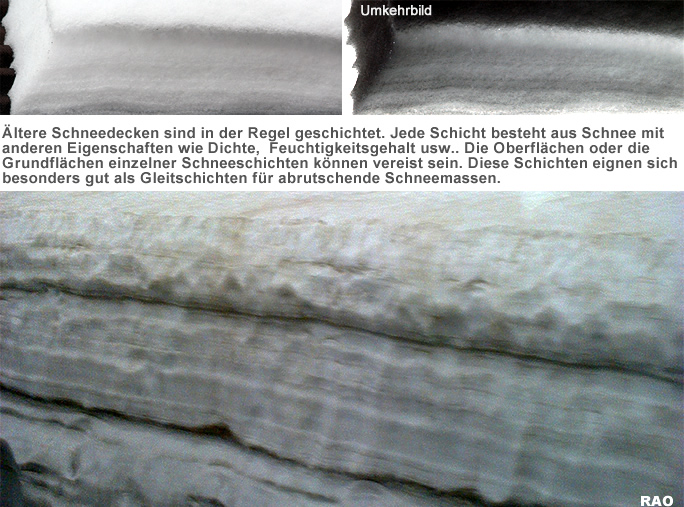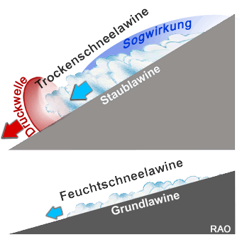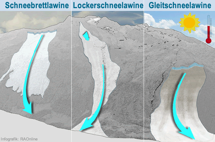Es gibt drei Grundtypen von Lawinen: die Schneebrettlawine, die Lockerschneelawine und die Gleitschneelawine. Bei bestimmten Bedingungen kann sich aus einer Schneebrettlawine eine Staublawine und aus einer Lockerschnee- bzw. Schneebrettlawine eine Nasschneelawine entwickeln. Schneebrettlawinen Schneebrettlawinen entstehen häufig bei instabilen Schneeschichten, wenn die aufeinander liegenden Schneeschichten teilweise aus unterschiedliche Schneekristallstrukturen aufgebaut sind, und dabei mindestens eine dieser Schichten schlecht mit einer benachbarten Schicht verbunden ist. Schneebrettlawinen werden häufig durch die Einwirkungen äusserer Kräfte (Bps.bei einer Zusatzbelastung durch Schneesportler) ausgelöst. Das Schneebrett löst sich entlang einer meistens mehrerer Meter langen, beinahe geradelinigen Bruchlinie von den übrigen Schneemassen ab. Lockerschneelawinen Lockerschneelawinen werden meistens aufgrund von klimatischen Einflüssen (Schneefall, Erwärmung, Sonneneinstrahlung usw.) an einem Punkt in einem steilen Gelände ausgelöst. Der fliessende Schnee reisst auf seinem Weg ins Tal weitere Schneemassen mit. Gleitschneelawine Bei einer Gleitschneelawine rutscht die gesamte bis auf den Boden reichende Schneedecke ab einer Bruchlinie hangabwärts. Als Gleitschicht dient die stark durchfeuchtete Grundschicht oder die auf dem Boden aufliegende Schmelzwasserschicht. Gleitschneelawinen bilden sich häufig während Erwärmungsphasen im Hochwinter oder bei steigenden Temperaturen im Frühling. Staublawinen In einem steilen Gelände kann sich aus einem Schneebrett mit trockenem Schnee eine Staublawine entwickeln. Staublawinen schieben eine Druckwelle vor sich her. Hinter der Lawinenfront entsteht kurzzeitig ein Unterdruck mit Sogwirkung. Staublawinen rasen mit grosser Geschwindigkeit talwärts. Nassschneelawinen Nassschneelawinen treten häufig nach Regenfällen auf, wenn das einsickernde Regenwasser die obersten Schneeschichten durchnässt und so destabilisiert. Nassschneelawinen können entlang einer Bruchlinie als Schneebrett oder an einem Auslösepunkt als Lockerschneelawine entstehen. Nassschneelawine entwickeln eine grosse Zerstörungskraft, da sie aus feuchtem Schnee mit grosser Dichte bestehen.